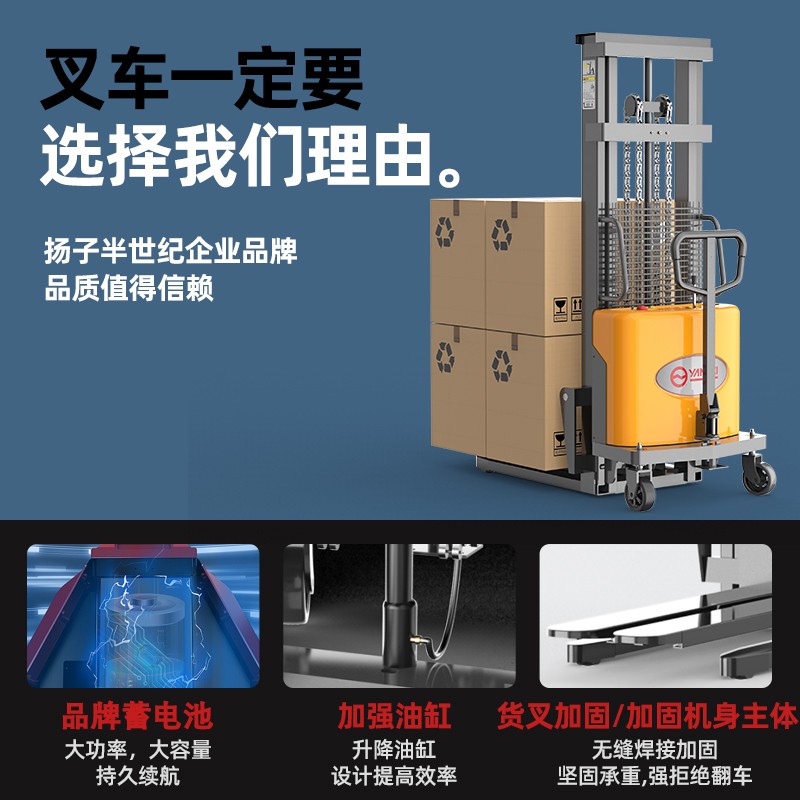 揚子YZ-B系列步行式半電動堆高車:自動液壓叉車,半電動推高車的使用多功能簡潔操作臺,可以有效的防止車子在卸貨當中出現滑動現象。加強油缸安全使用,更能提升效率的使用。